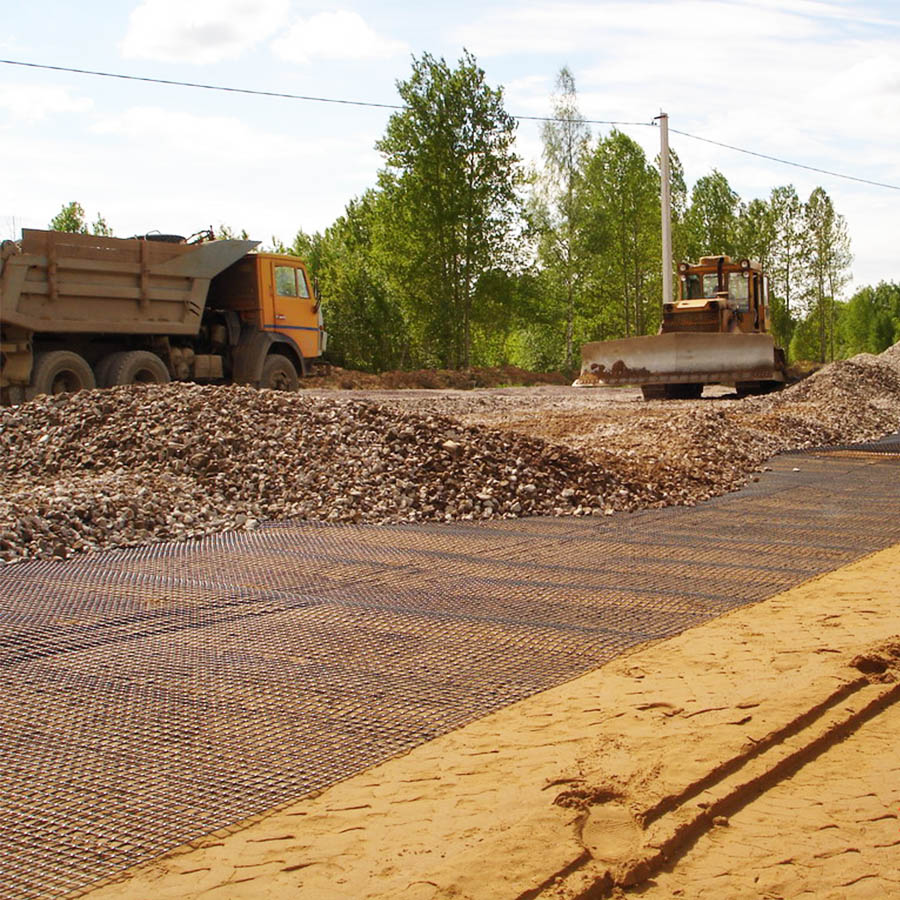 Геосетку укладывают на подготовленное песчаное или грунтовое основание под слой крупнофракционного материала. Размер ячейки геосетки должен соответствовать размеру средней фракции щебня для обеспечения эффекта блокировки частиц в сетке. В результате прочность основания дороги, площадки существенно увеличится. При условии качественной трамбовки насыпного материала будет обеспечено отсутствие колейности, ям и деформационных сдвигов.